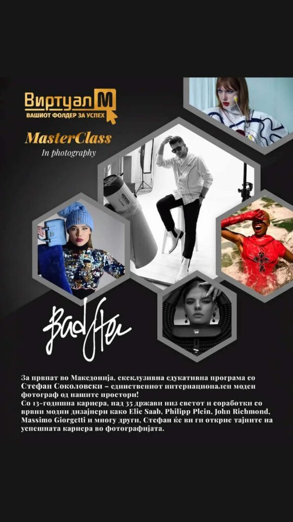 СПЕЦИЈАЛЕН ПОПУСТ И ВАУЧЕР ОД 6000 ДЕНАРИ ЗА ЦЕЛАТА ЕДУКАЦИЈА ДО КРАЈ НА МЕСЕЦОТ! Подготви се за трансформација! Ова не е само курс – ова е искуство што те лансира во светот на професионалната фотографија. Учиш од врвниот светски фотограф – Стефан Соколовски! Човекот чиј објектив фатил кадри од светски модни недели, кампањи со познати брендови и лица од светската сцена. MASTERCLASS академијата по фотографија е твојот прв чекор кон интернационална кариера. Без разлика дали си почетник или имаш искуство – ова е место каде талентот се претвора во професионализам. ШТО ЌЕ НАУЧИШ: Уметничка, модна и портретна фотографија. Работа во студио и на терен – осветлување, позиционирање, композиција. Напредна дигитална обработка со Adobe Photoshop. Креирање на личен портфолио бренд. Финален професионален проект со менторска поддршка.